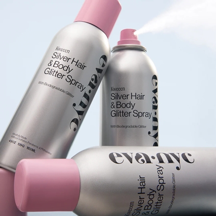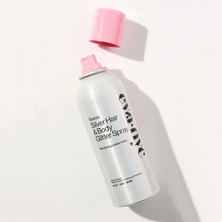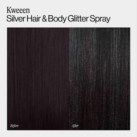 თმის და სხეულის ბრჭყვიალა სპრეი ვერცხლისფერი გლითერებით.